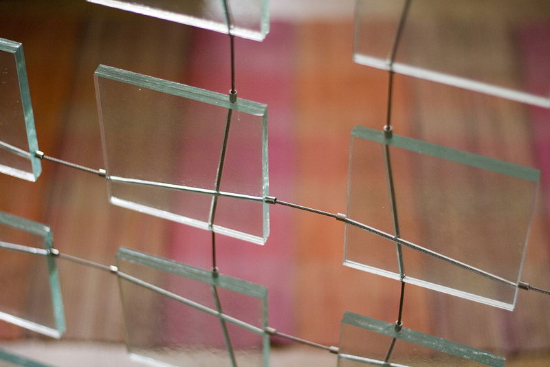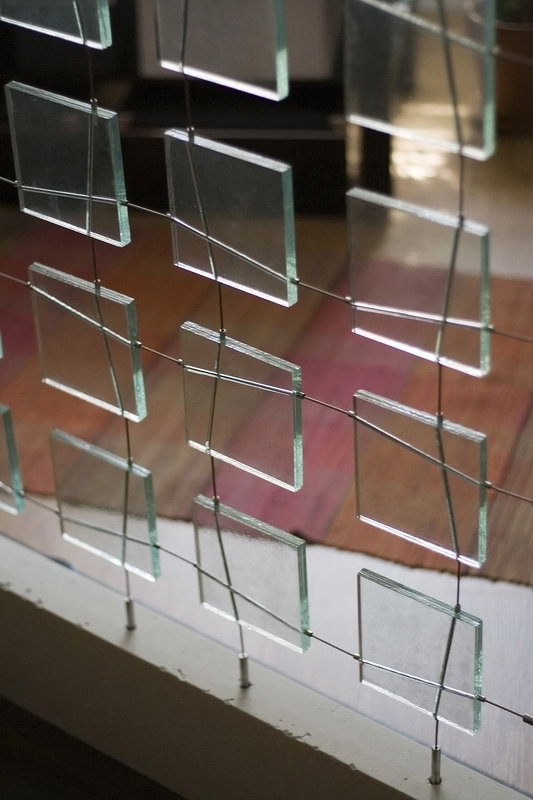 Az üveg-acélhuzal kombinációja a tér egyedi strukturálását eredményezi. Átvezetés a térérzetek között, egy köztes fázis.