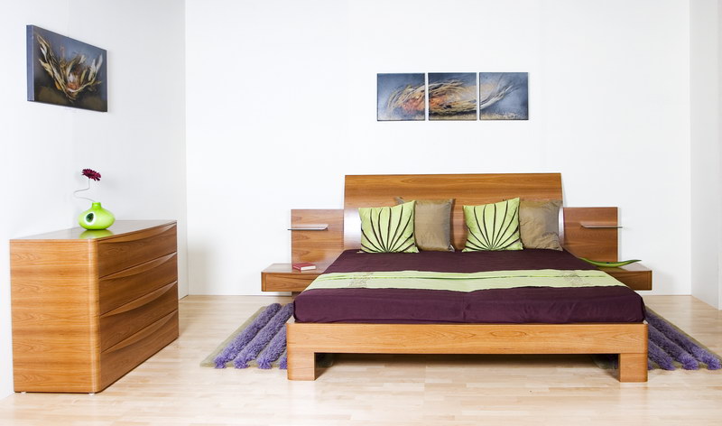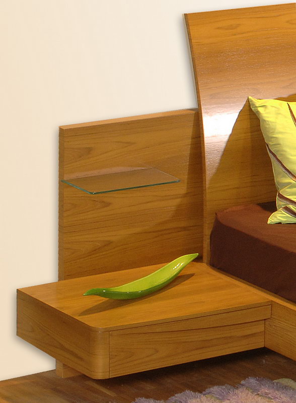 Teak furnéros ívelt háttámlájú ágy kétoldalt éjjeliszekrény fiókkal, az egyenes háttámlába mart üvegpolccal, amely kiegészül egy négyfiókos komóddal.