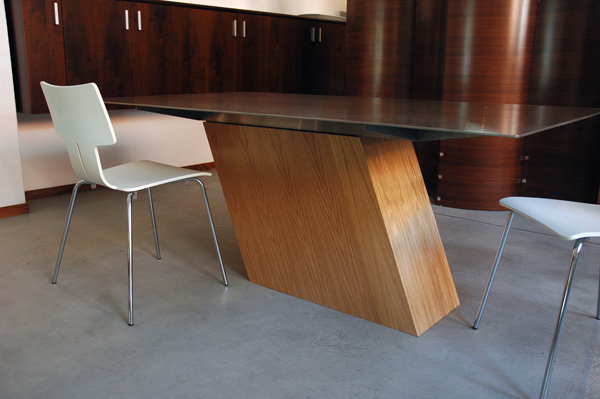 Rombusz tárgyalóasztal terve a Ligeti Stúdió számára készült, a Stúdió irodájának felújítása kapcsán. Az asztal acél lappal készült és tölgy lábakon áll. Formája, vonalvezetése jól tükrözi a megrendelő határozott stílusát, illeszkedik a helyiségbe és az általa tervezett bútorokhoz.