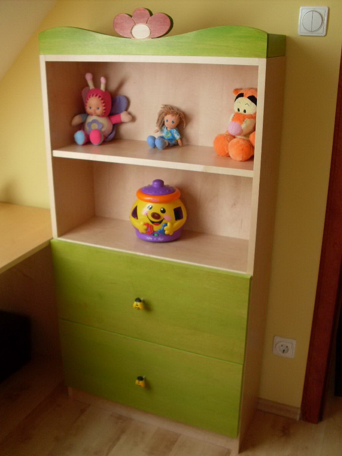 Teljes átalakuláson ment keresztül ez a zuglói tetőtéri gyerekszoba. Megrendelőim az összes bútorait egyedileg terveztették meg velem, amelyeket végül nyírfafurnéros bútorlapból és káros anyagoktól mentes felületkezeléssel (pác, lakk) készítettem el. A bútorokon megjelenő virágmotívumhoz kerestünk színben és mintában hozzá hasonló függönyanyagot.