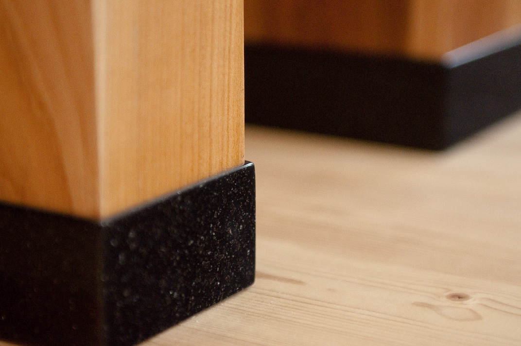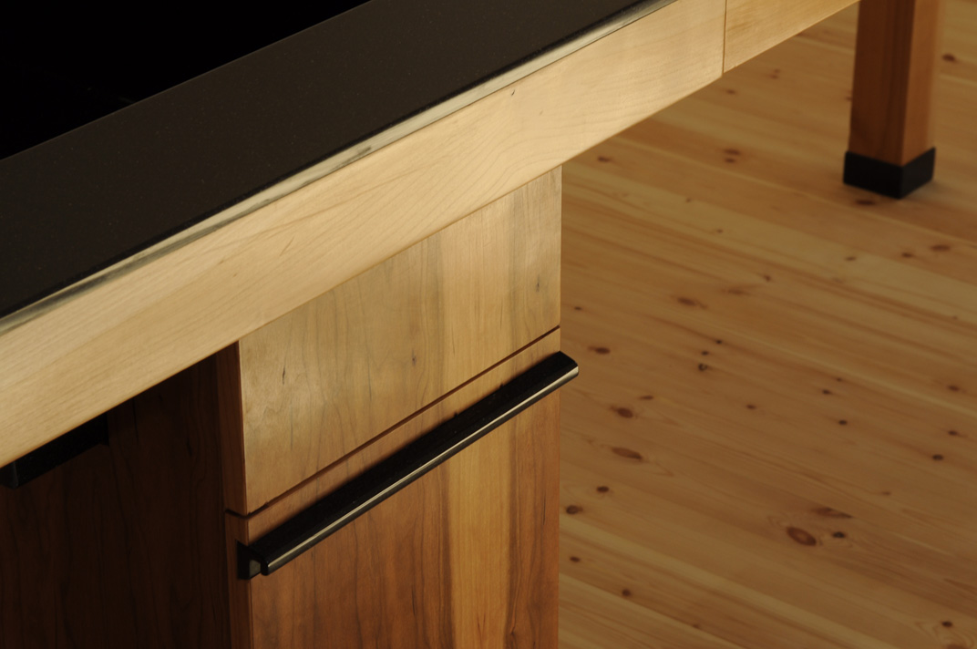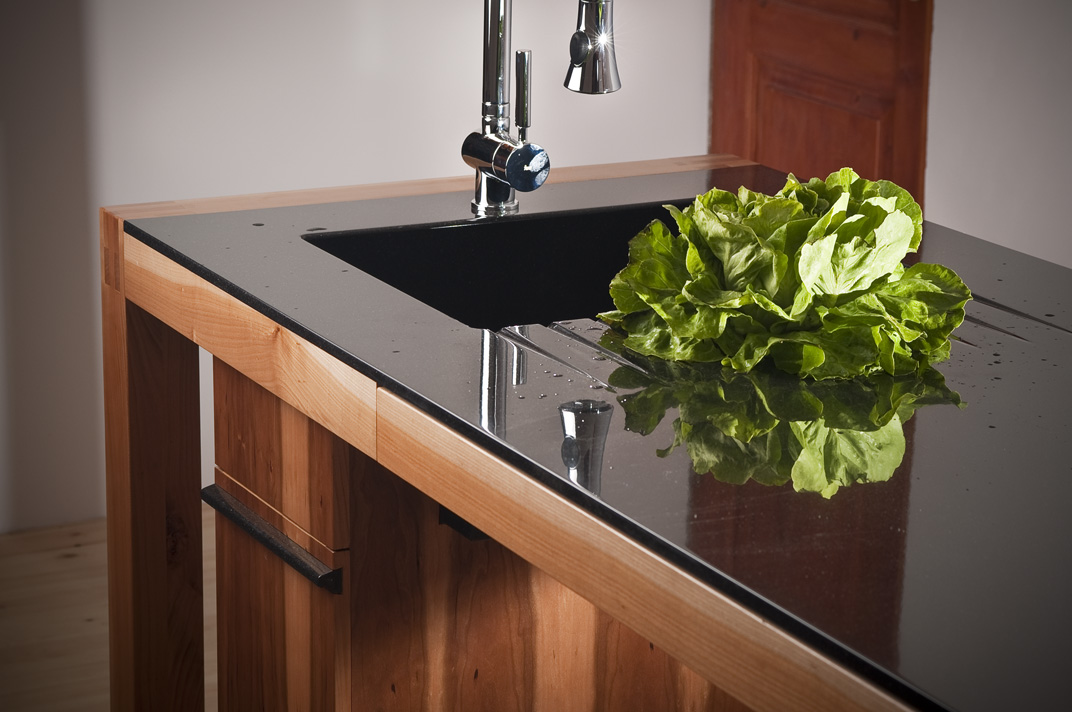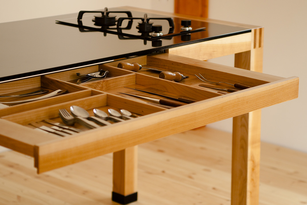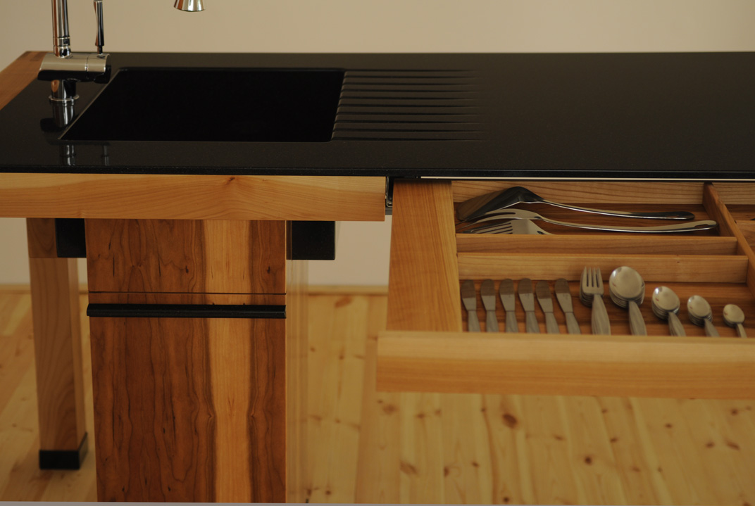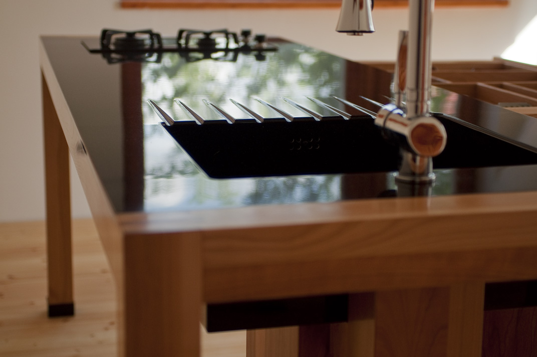 A konyhai munkapad ötvözi nagymamáink konyháinak hagyományos munkaasztalának formavilágát a mai konyhák elengedhetetlen elemivel: mosogató, főzőlap, munkapult. Ez a kombináció így összességében egy nyitott, szellős konyhai érzést sugároz.