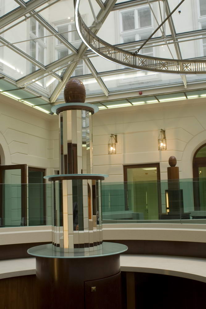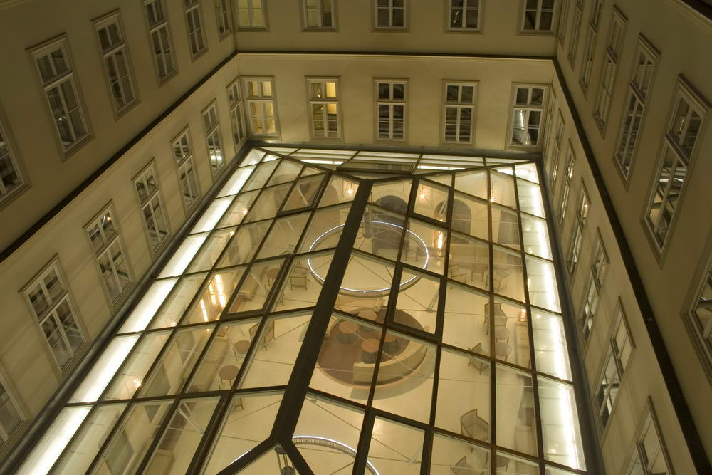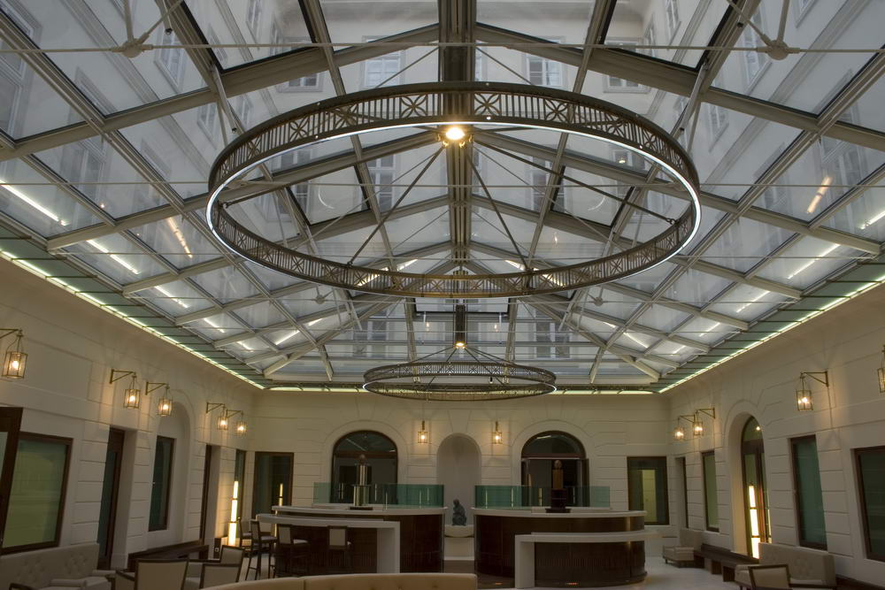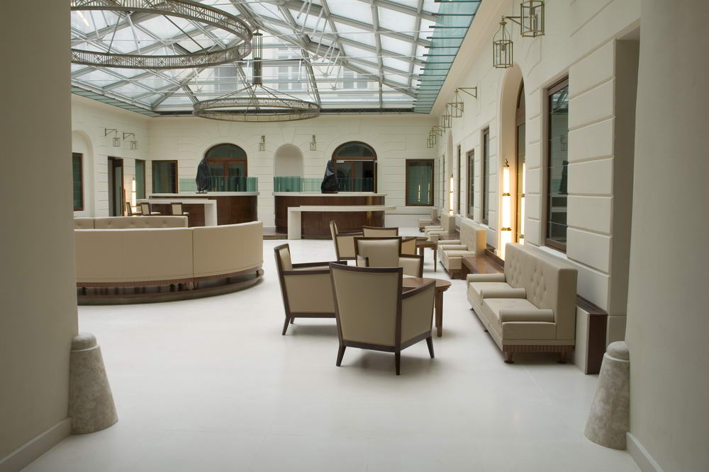 Az üvegtetővel lezárt belső udvar egyben a szálloda reprezentatív belső tere is, igényes kialakítást igényel.