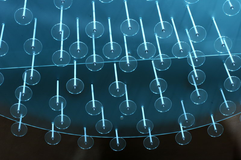 Kettő és fél méter hosszú elliptikus, három rétegű üveg felület az alap hordozója a közel 100 db. különböző méretben lelógó fényforrásnak. A különböző pálca hosszak által a fényforrások ill. azok felett közvetlenül elhelyezkedő üveg tárcsák egy hatalmas térbeli fél-lencse felületet képeznek. A halopin fényforrások dimmelhetőek, így a csillár a gyertyaláng fényerejétől a kápráztató ragyogásig szabályozható. Az alap hordozó üveg telített szinét a megfelelő vastagság és a savmaratás által létrejött fénytörés biztosítja.