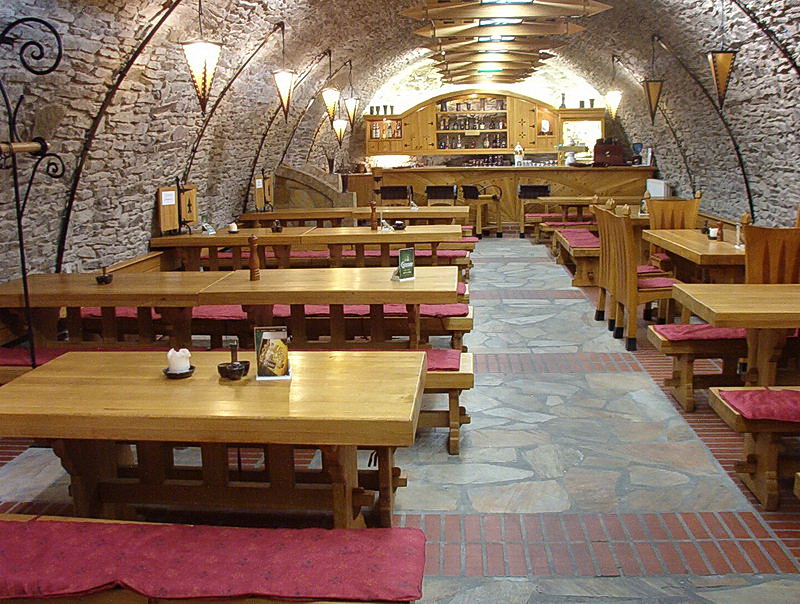 épület, az étterem eredeti kő-dongaboltozatos pincehelységben kapott helyet.