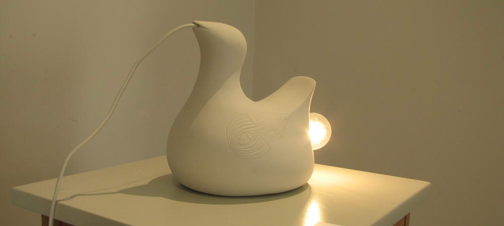 Madár formájú porcelán lámpa. Vagy tojás alakú madár. Vagy madár alakú tojás? Az életfa ágát tartja a csőrében? Dalol mint a népmesék pacsirtája, vagy szívja be az energiát, hogy élhessen? Működhessen? Hogy tojhasson illetve ragyoghasson? Hogy átjárja az áram és belülről izzhasson, hogy csatlakozhasson a világ impulzusaihoz? Csipp? Chip? Csíp? Mementó egy letűnő izzókornak. Nem felejtünk Ősök, egyszer a régi-égi lesz az új törvény.